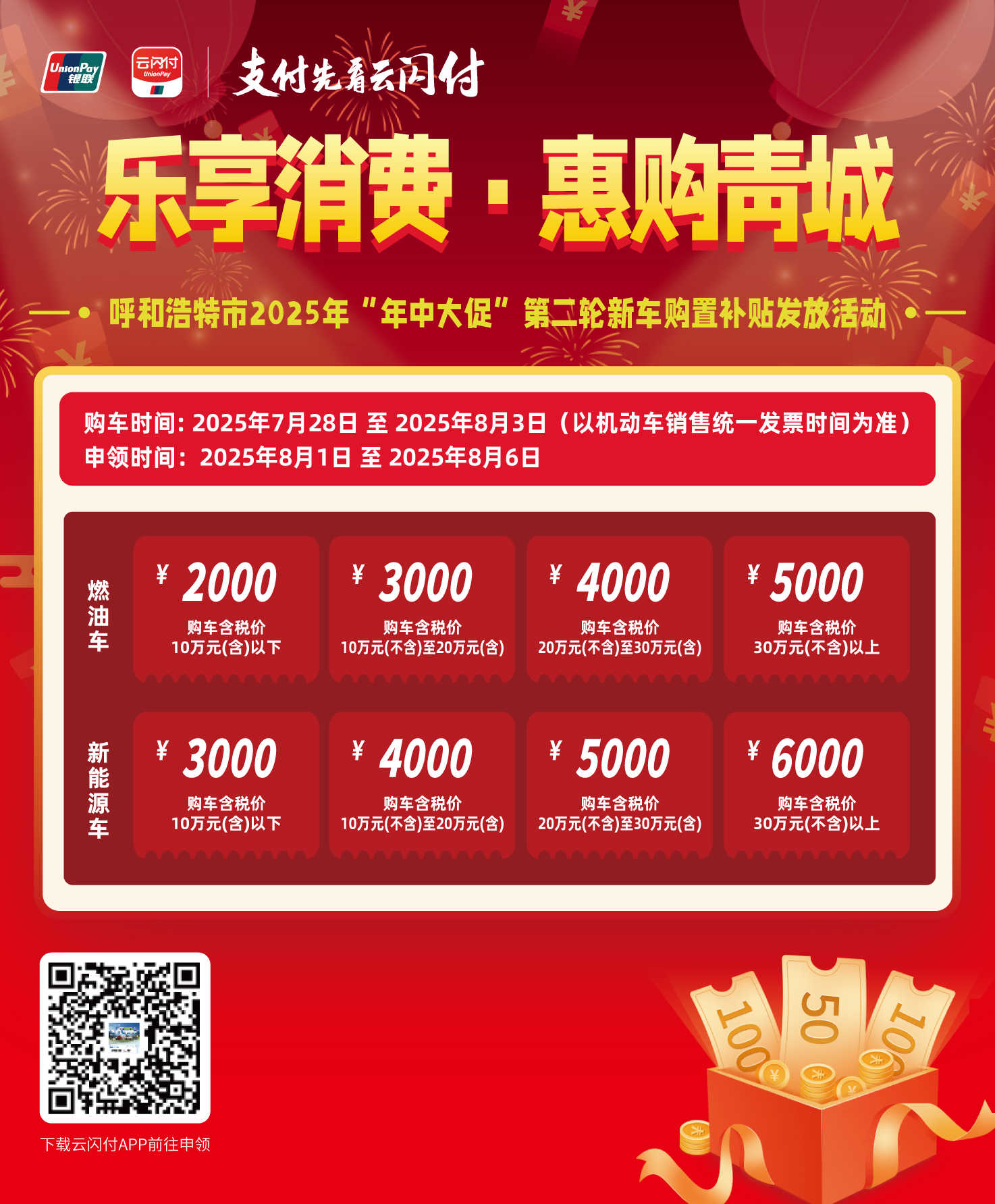 为进一步释放消费潜力,激发消费活力,更大力度惠及广大消费者,7月28日,呼和浩特市2025年“年中大促”第二轮新车购置补贴活动开启。