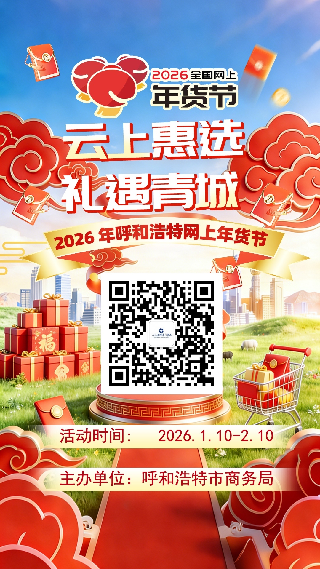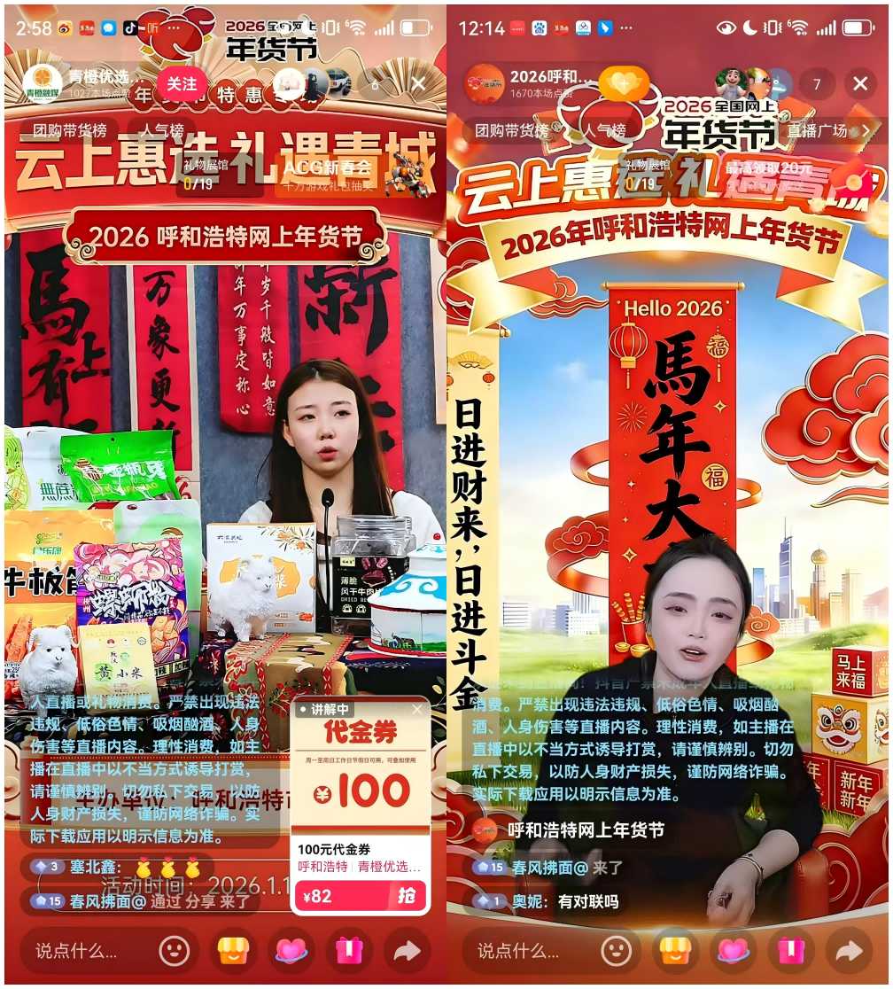 2026年2月10日,由自治区商务厅指导,呼和浩特市商务局主办,呼和浩特市融媒体中心、自己的歌直播孵化基地承办的“云上惠选 礼遇青城”2026年呼和浩特网上年货节于2月10日圆满落幕,历时30天,累计订单量167万单,交易额突破8200万元。