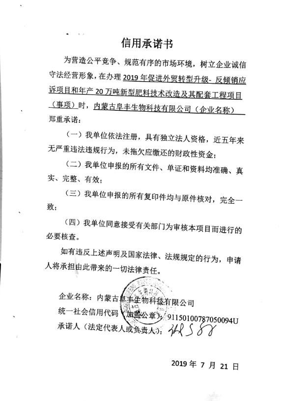内蒙古阜丰生物科技有限公司申请外经贸专项项目资金信用承诺
